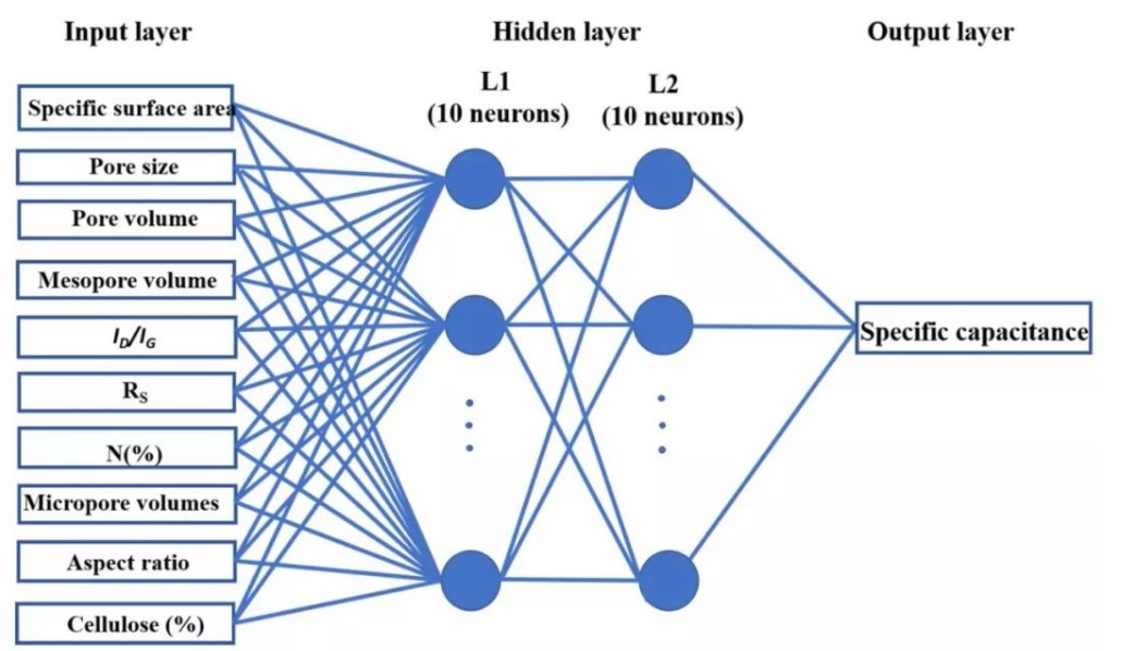 近年来,将生物质基活性碳材料应用在储能领域是一大研究热点,关于陆生生物为前驱体的文献报道已有很多,对于海生生物的研究相对较少。海藻属于大型藻类,过量堆积会爆发绿潮,破坏海洋生态系统,寻找一种环保经济的处置方式迫在眉睫。由于生物质种类多样性,碳材料的结构也各不相同,到目前为止,生物质基超级电容器的电极材料构效关系尚无定论,在众多的生物质结构特征中,对电化学性能的相对重要性还未报道。随着计算机科学与数据挖掘技术的迅猛发展,应用机器学习算法对多因素变量进行预测与分析已成为可能。人工神经网络是一项人工智能时代最为成熟的技术,通过模拟人脑的认知过程构建若干隐藏层,前向传播与反向传播相互协调,得到输入与输出变量的函数关系。将该模型引入到超级电容器中,寻找构效关系是简单可行的方法。