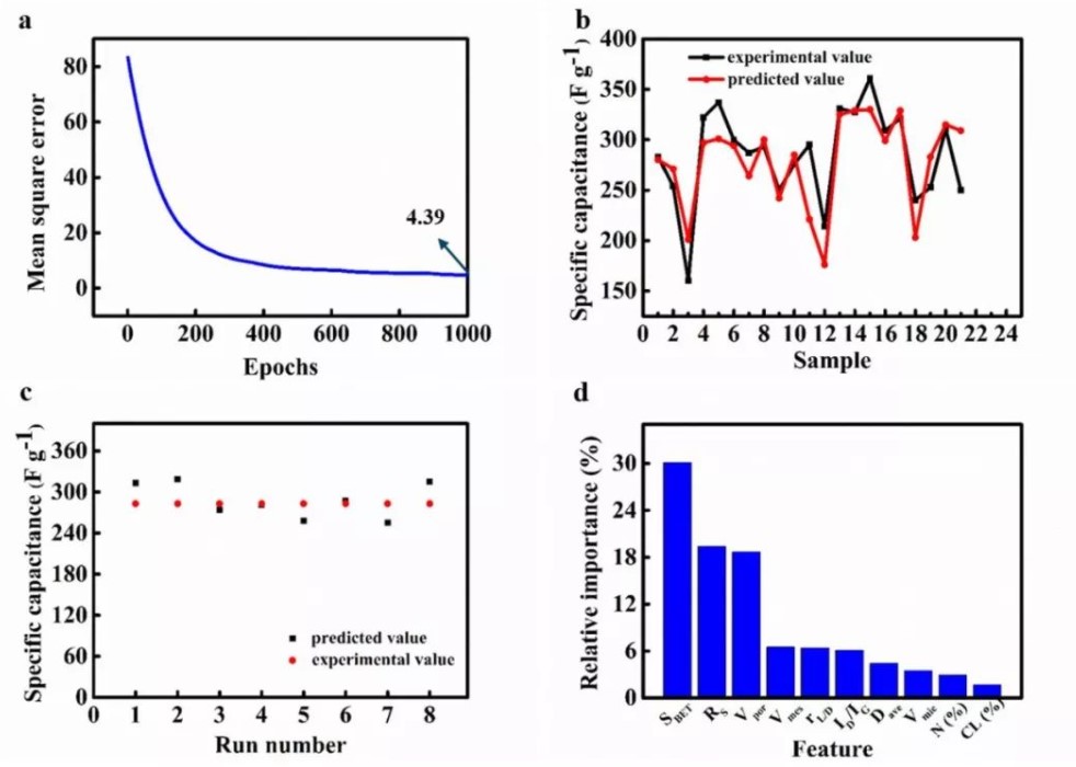 图6 人工神经网络模型对生物质基超级电容器性能的预测效果;(a)预测值与真实值的均方误差随迭代次数的变化;(b)验证集数据的真实值与预测值比较;(c)不同运行次数的海藻基活性炭的电化学性能预测;(d)生物质结构特征对比电容的相对重要性。