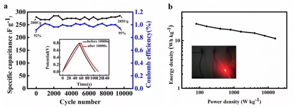 图3 (a)NFAC-c的循环稳定性测试,附图为第1次与循环充放电10000次之后的恒流充放电曲线对比;(b)NFAC-c的功率密度与能量密度关系图,附图为两块纽扣式超级电容器串联点亮的LED灯。