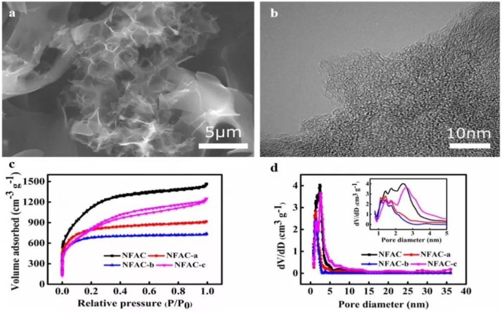 图1 (a)NFAC-c的SEM图片;(b)NFAC-c的TEM图片;(c)不同酸性溶液处理后的活性炭的氮气吸脱附等温曲线;(d)不同酸性溶液处理后的活性炭的孔径分布。