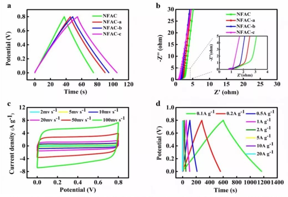 图2 不同酸性溶液处理后活性炭的电化学性能;(a)在电流密度为1A/g的条件下,测试的恒流充放电曲线;(b)频率范围在0.01 Hz-100k Hz时的交流阻抗图谱。NFAC-c的电化学性能;(c)不同扫描速率下的循环伏安曲线;(d)不同电流密度下的恒流充放电曲线。