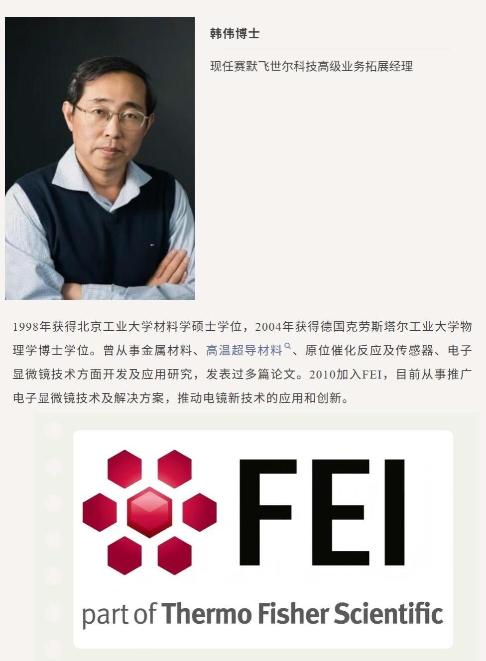 本次报告韩伟博士将介绍赛默飞双束电镜的最新技术进展和相关案例,如截面分析与成像、TEM样品制备、三维表征技术。报告也将介绍FIB技术的最新发展,比如聚焦等离子源技术的特点及应用。