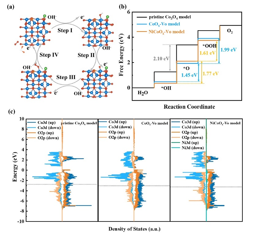 为了进一步探究氧空位和杂原子Ni在引入氧化钴的结构中对Co活性位点的作用,构建了以下三个催化剂模型分别是pristine-Co3O4、CoOx-Vo和NiCoOx-Vo models。分析产氧反应的四个基元反应步骤所需的ΔG,发现氧空位的引入降低了Step Ⅱ 所需的ΔG2且增强了对活性物种*O的吸附能力,在进一步引入Ni后,调控了中间产物活性物种*O的吸附能力(ΔG2增大),同时又降低了Step Ⅲ 所需的ΔG3。从电子能带结构图中可以看出氧空位和杂原子Ni都促使费米能级附近的态密度有所增加,说明催化剂表面的导电性有所提高。另外,进一步通过分析金属活性原子Co的d带中心也证明了氧空位和杂原子Ni对反应物的吸附能力具有一定调控作用。
