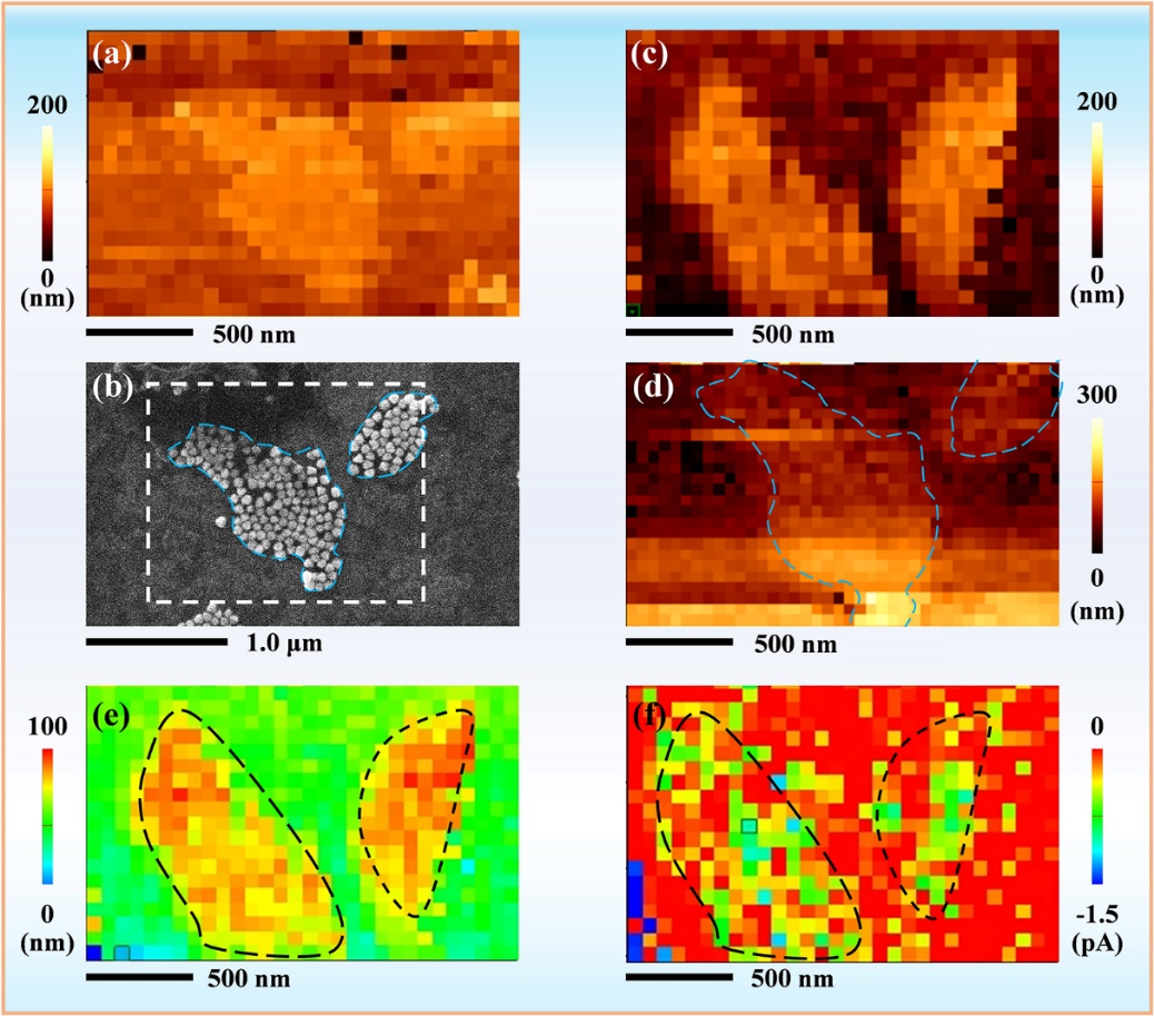 图5. (a),(c),(d)和(e)~45 nm纳米颗粒自组装单层的SECCM形貌学图像;(b)样品的SEM图像(f)SECCM 测试中同时得到的电化学活性图像。