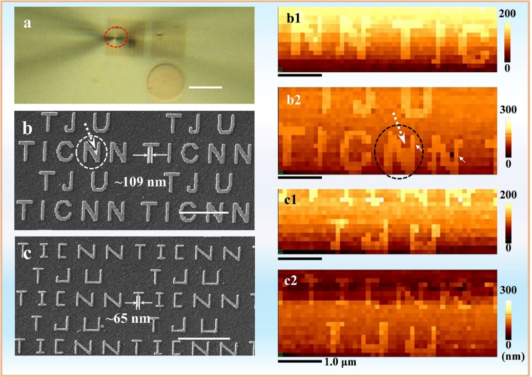 图4. (a)光学显微镜图像,(b)和(c)~109 nm和~65 nm线宽的‘TJU-TICNN’图标阵列的SEM图像;(b1和b2)和(c1和c2)~109 nm和~65 nm线宽的‘TJU-TICNN’图标阵列的SECCM形貌图像。
