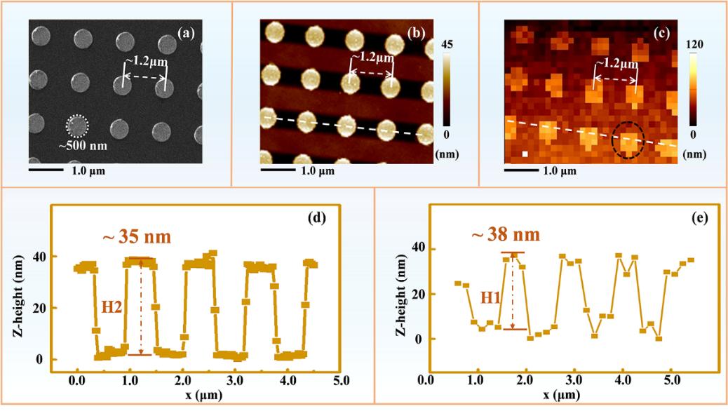 图2.(a)和(b)直径为~500 nm点阵的SEM和AFM图像;(c)SECCM 形貌图像;(d)和(e)样品的AFM和SECCM高度曲线。