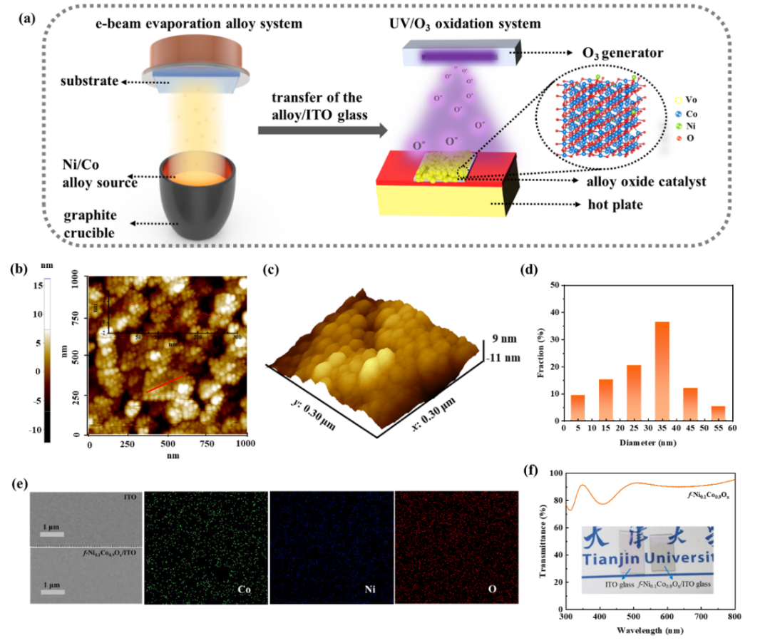 亮点1:本论文通过电子束蒸发合金及紫外臭氧氧化方法制备了厚度仅10nm、光学透明的NiCo合金氧化物薄膜催化剂,该方法可以实现一定范围内的大面积、任意形状的催化剂薄膜电极制备。
