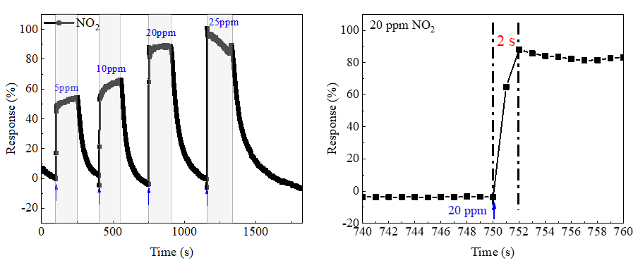 The graphene-based gas sensor prepared by CVD graphene can achieve a fast response to NO2 at room temperature. As can be seen from the figure, our response time can reach 2 s.