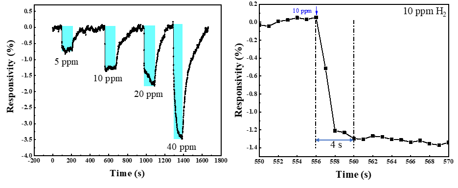 The graphene-based gas sensor prepared by CVD graphene can achieve a fast response to H2 at room temperature, and the response time can reach 4 s.
