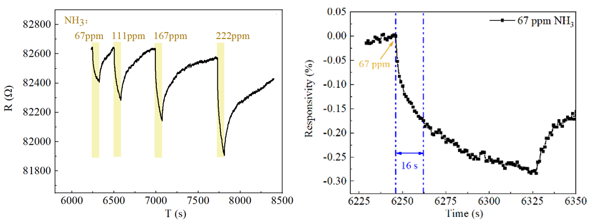 The graphene-based gas sensor prepared by TRGO (thermal reduced graphene oxide) can achieve a rapid response to NH3 at room temperature, as shown in the figure, our response time can reach 16 s (60%).
