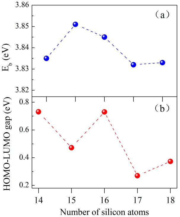 图5. CrSinˉ(n=14-18)团簇的平均结合能和HOMO-LUMO gap。