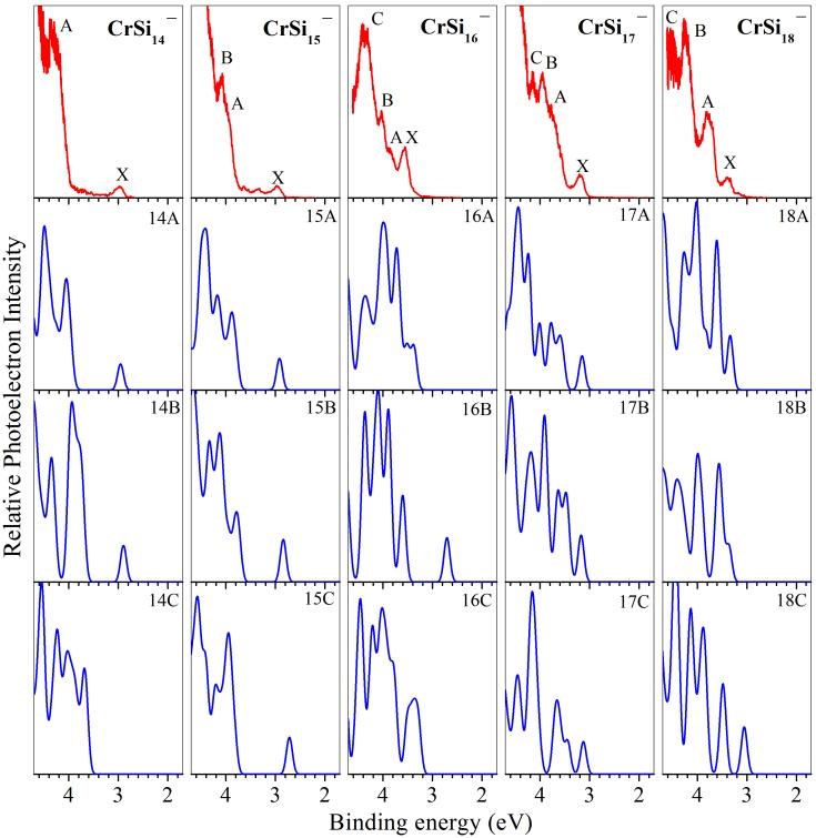 图1. CrSinˉ(n=14-18)团簇的实验(红线)和理论(蓝线)光电能谱对比图。