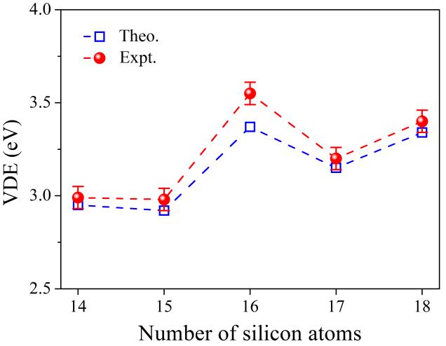 图4. CrSinˉ(n=14-18)团簇的实验和理论垂直电离能。