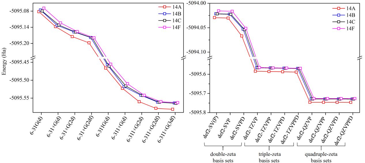 图3. CrSi14ˉ团簇的四个异构体在Pople-type基组和Karlsruhe-type基组的相对能量。