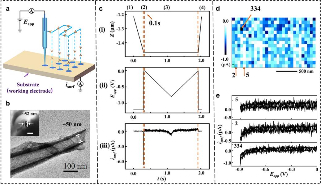 图1.(a)SECCM运行原理图;(b)探针的TEM 图像;(c)SECCM运行过程中相应的信号响应曲线(d)和(e)SECCM测试得到的电化学活性图像和曲线。