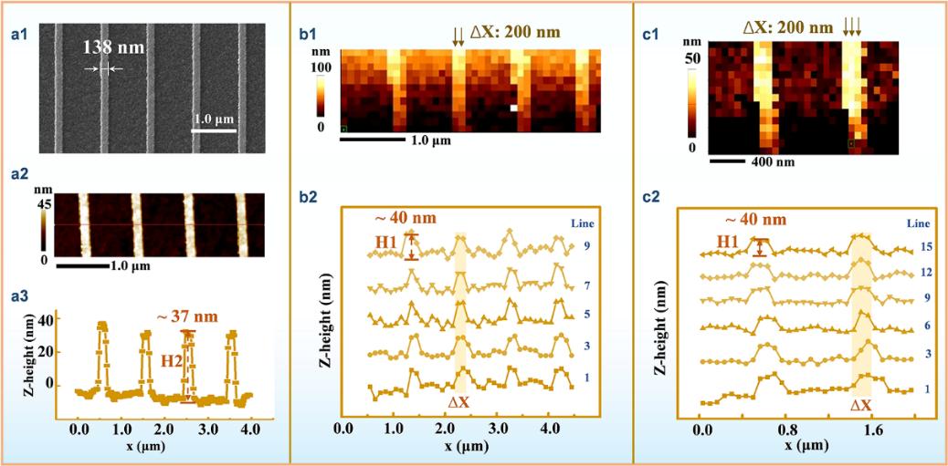 图3. 线宽为~138 nm的条带矩阵形貌图像(a1-SEM,a2-AFM,b1和c1-SECCM)和高度曲线(a3对应a2, b2和c2分别对应b1和c1)。