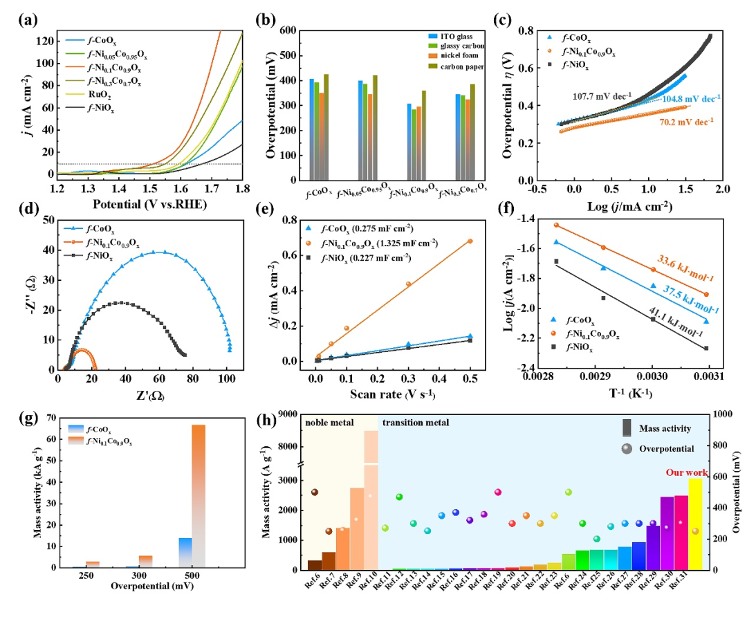 研究发现,电催化产氧活性与氧空位浓度的关系并非呈正相关,随着Ni比例增加,产氧活性逐渐增加,当Ni/Co比例为1/9, NiCo合金氧化物的合金比最佳,优化后的f-Ni0.1Co0.9Ox显示出优异的OER性能,分别在250 mV和300 mV过电位下表现出3.05 kA g-1、5.56 kA g-1的质量活性。当Ni/Co比例进一步增加时,OER性能降低,说明氧空位的浓度在一定范围内是有利于催化活性提高的,但过多的氧空位对催化活性具有一定的抑制作用。因此,寻找氧空位浓度和催化活性的构效关系对优化合金氧化物催化活性至关重要。另外,质量活性用来衡量金属基催化剂的催化效率为生产降低成本,提高金属原子利用率具有重要意义。