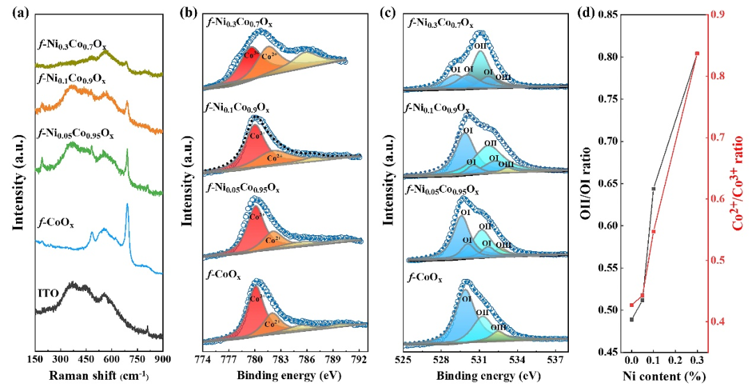 图2:不同Ni/Co比对应的NiCo合金氧化物的化学成键、氧空位比例的分析
