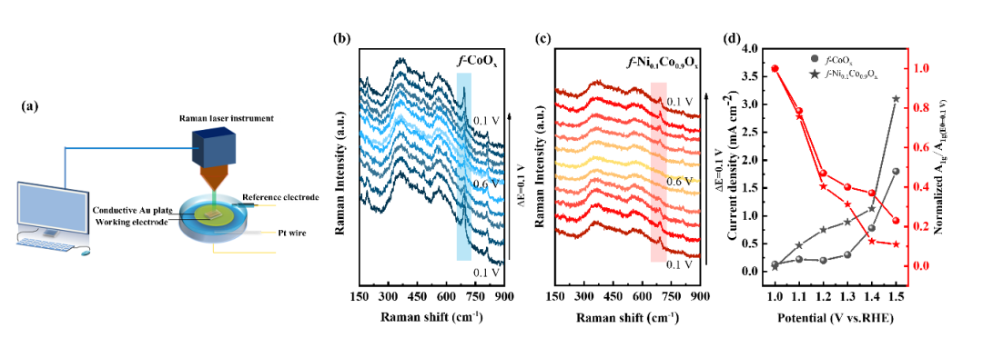 为了探究在OER反应中真正参与反应的催化剂活性物种和催化剂的结构,采取原位拉曼光谱仪与电化学联用,施加不同电势观察催化剂表面的拉曼信号变化。结果发现,随着电势的增加,f-CoOx和f-Ni0.1Co0.9Ox的尖晶石结构的拉曼特征峰都在减弱,在发生OER反应前特征峰几乎消失;随着电势减弱,尖晶石结构的拉曼特征峰峰强逐渐恢复证明了该尖晶石结构的相变可逆过程。该实验结果说明催化剂薄膜是以无定型结构参与OER反应,并且一定程度的提高氧空位的比例促使了催化剂在较低电位下形成无定型结构促进OER反应。
