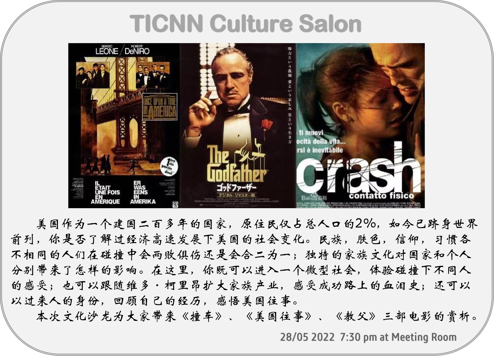 本次文化沙龙为大家带来《撞车》、《美国往事》、《教父》三部电影的赏析。