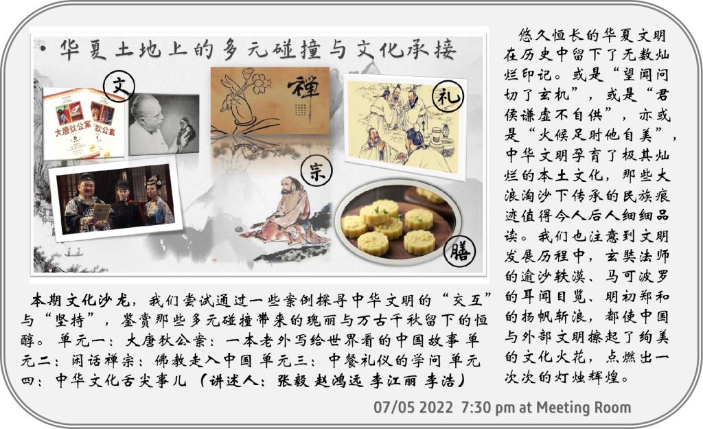 本期文化沙龙,我们尝试通过一些案例探寻中华文明的“交互”与“坚持”,鉴赏那些多元碰撞带来的瑰丽与万古千秋留下的恒醇。 单元一:大唐狄公案:一本老外写给世界看的中国故事 单元二:闲话禅宗:佛教走入中国 单元三:中餐礼仪的学问 单元四:中华文化舌尖事儿 (讲述人:张毅 赵鸿远 李江丽 李浩)。